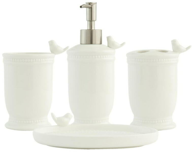 Fehér kerámia 4 db-os fehér madárkás fürdőszoba szett – Elegáns és természetes kiegészítő a fürdőszobába